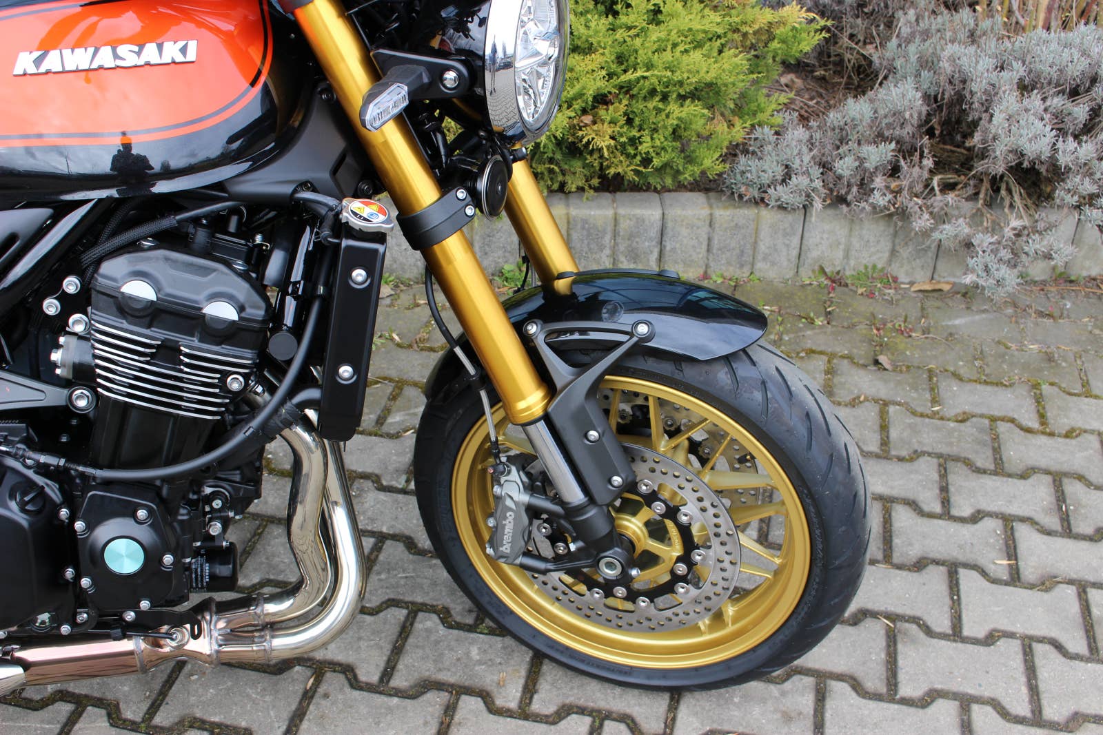 Přední brzdové třmeny, destičky i kotouče o průměru 300 mm jsou dodané od prémiové značky Brembo. Radiální monoblokové brzdové třmeny Brembo M4.32, skvěle doplňuje radiální brzdová pumpa Nissin o průměru 17,5 mm respektive 19,1 mm u standardního modelu. Nerezem opletené pancéřové hadice poskytují větší brzdnou sílu a nabízí lineární nástup při ovládání brzdové páčky, což usnadňuje přesné ovládání přední brzdy.