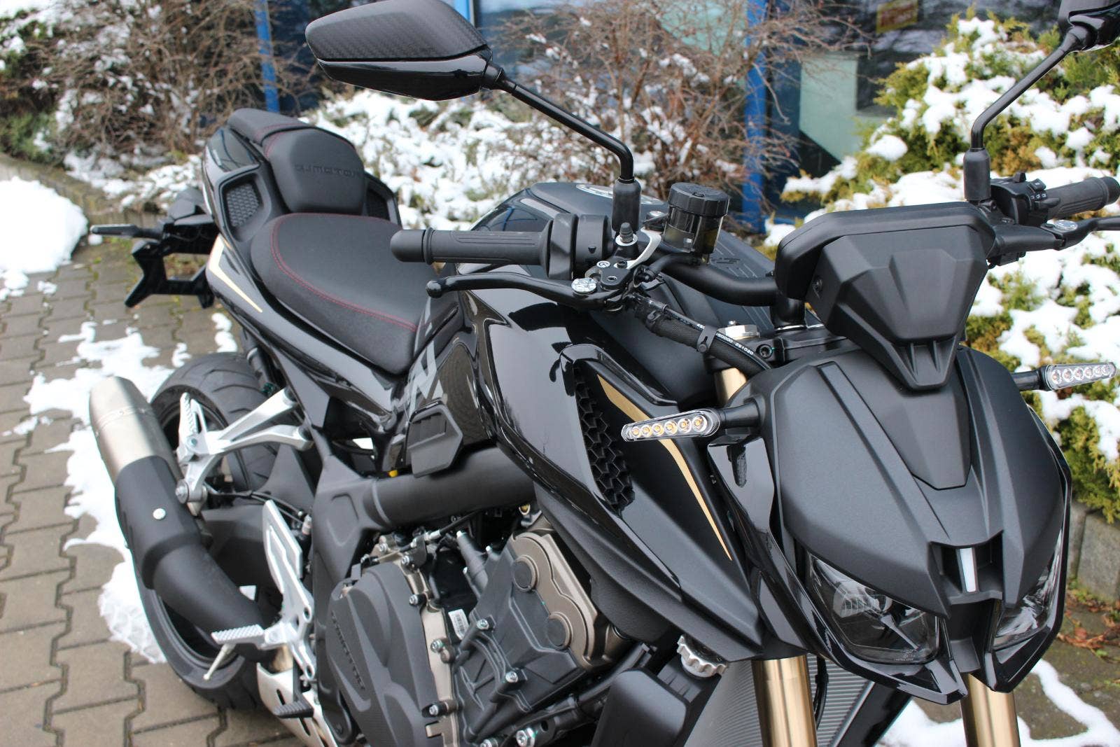 SRK 800 má z výroby krásné šesti-diodové blinkry, které svým designem dokonale pasují k tomuto sportovnímu motocyklu. Navíc už v sériové výbavě mají sekvenční, nebo chcete-li animovaný průběh blikání, což je oblíbená vychytávka moderních motocyklů i automobilů.